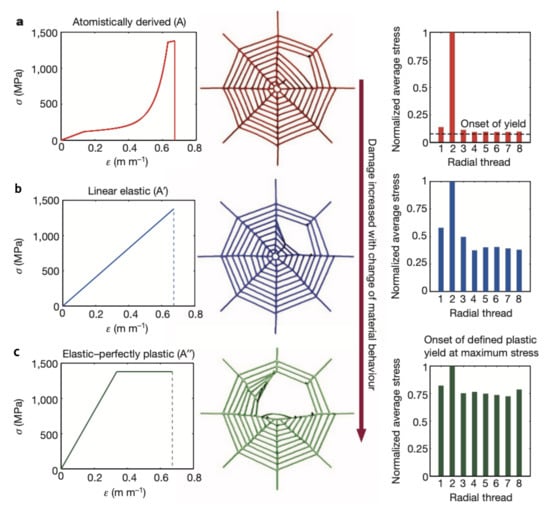 Cranford et al. [71] simulated the response of spider webs made of different types of fibers with completely different mechanical behaviors (Figure 8). Model (a) refers to the stress–strain behavior of the dragline silk from the species Nephila clavipes. Four distinct regimes characterize the behavior: an initial linear part governed by stretching, an unfolding of the protein domain resulting in a softening that continues with a stiffening regime, and, finally, a stick-slip deformation. Models (b) and (c) refer to idealized engineered materials with linear elastic and elastic–plastic behavior, respectively.