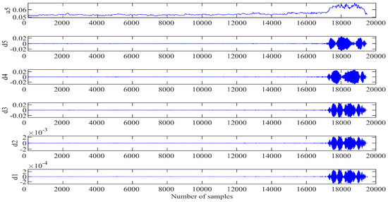 After the engine system entering into instability, the information of the unsteady flow presents the characteristics of multi-category, multi-parameter, and multi-dimensional random data. Therefore, the procedure of the system instability is a complex nonlinear dynamic system evolution process. Since the SVR model cannot eliminate the defect of prediction error caused by uncertain factors, the wavelet transform (WT) provides a tool to improve the prediction accuracy of the dynamic system instability. Based on the GWO-SVR modeling progress, a hybrid prediction model is proposed in this part in combination with the wavelet transform, named as the WT-GWO-SVR model. Using the multi-scale analysis of the wavelet transform to preprocess the space mode obtained, the db5 wavelet basis function is selected to decompose and reconstruct the first-order space mode at 5 scales. Since the information of the original spatial mode will be lost when the number of decomposition levels exceeds 5, the optimal number of wavelet decomposition levels is 5, as shown in Figure 4.