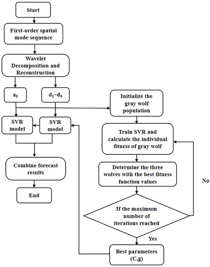 Figure 4 shows the approximate component a5 (low frequency) of the fifth layer and the other detail components d1 to d5 (high frequency) of each layer. The approximate component represents the change trend of the first-order spatial mode, accounting for the majority of the whole information. The phase space of each component is reconstructed and divided into two parts: the training sample set and the test sample set. Then the GWO optimization algorithm is applied to determine the penalty factor C and the kernel parameter g of the radial basis function. The population size of the wolves is set to be 20 with the maximum number of iterations as 100. The system modeling with SVR is trained according to the normalized training sample data and the individual fitness function values of the gray wolf calculated. The position information of the three wolves with the best fitness function value is saved for next step. The location of the individual gray wolf can be constantly updated through the adaptive iterative program with the best fitness value as the output for the optimal parameter combination (C, g). The SVR model with optimized parameters is checked with the test sample data for evaluation the final generalization ability of the SVR prediction model, and the prediction of each component is obtained through the inverse normalization processing. Finally, the results of the approximate components and detail components are combined together to achieve the final prediction of the spatial mode in the field [27]. The modeling process of WT-GWO-SVR hybrid model is indicated in Figure 5.
