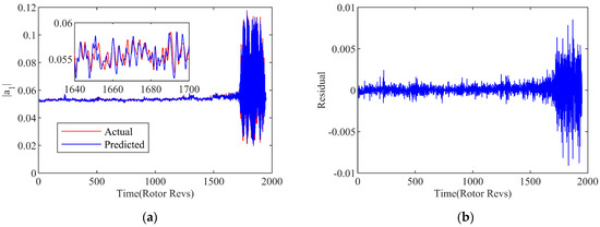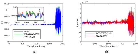 With the selection of the embedding dimension m as 18, the phase space reconstruction of the first-order space mode is performed, and the value of each step is predicted according to the 18 steps prior to the current location. Figure 6 show the single-step prediction results of the first-order space mode on the basis of the hybrid SVR models at 3000 rpm. Although there are still errors between the actual value and the prediction, the extreme high reliability and accuracy are fully implied in the hybrid SVR modeling the system for the overall operating state.
