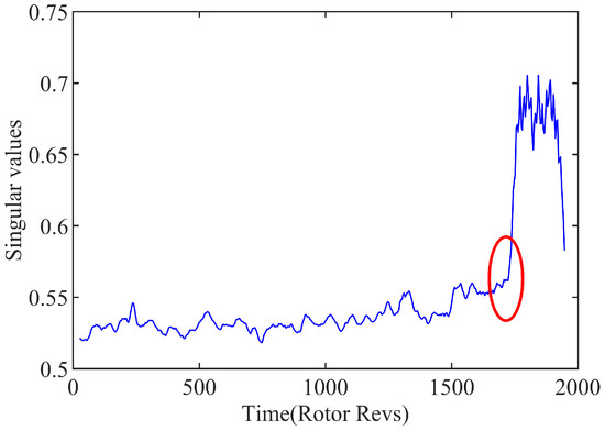 By calculating the wavelet singular spectrum entropy of the spatial mode in the compressor system, the precursor of rotating the stall can be identified by using the difference of entropy before and after the instability. According to the discussion on the parameter selection of the wavelet singular spectral entropy [11], the sliding window is set as 100, and the sliding step size is set as 20 to analyze the spatial pattern predicted for the inception recognition. In order to assess the wavelet singular spectrum entropy conveniently, the singular eigenvalues are calculated for each window, as shown in Figure 8. The singular values of spatial pattern can be effectively extracted up as the indexed signal to restore the basic feature of the system. And it can be used to quantitatively distinguish the distinction cross the instability boundary in the modal space of system, as circled in the chart.