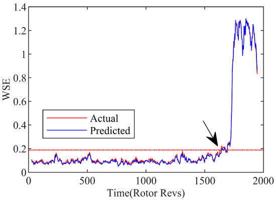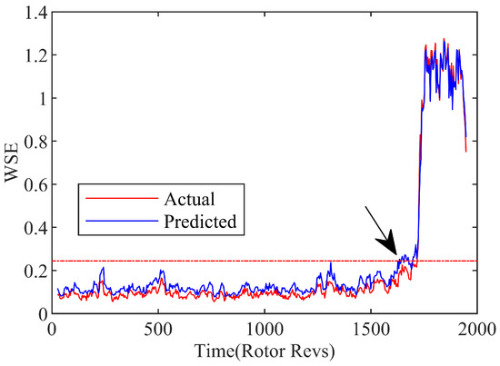 Figure 12 reveals the curve of the wavelet singular spectrum entropy with the 20-step prediction model, as well as the actual processing data of the experiment. Although the wavelet singular spectrum entropy predicted by the multi-step method deviates a bit from the actual value, it is still under the domination within a certain deviation tolerance range. Similarly, the stall precursor recognition threshold is set according to the 3σ principle, as expressed by Equation (27). The intersection of the dotted threshold line and entropy signal is considered to be the location of the stall precursor predicted, which is represented by arrow at approximately 1634r. Because of the 20 timesteps corresponding to 0.08 s, thus the efficient prediction point is 0.08 s (4R) ahead of the identification spot. Therefore, on account of WT-GWO-SVR hybrid multi-step prediction model, the system instability of the compressor can be in recognition of 102r in advance by the wavelet singular entropy identification strategy.