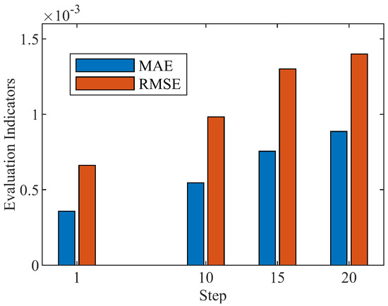 Simultaneously, as to assess the performance of the multi-step prediction method, the MAE and RMSE evaluation indexes are indicated here to compare the performances of the different prediction steps. The overall error of the prediction performance is reflected by the indicator of the MAE, while the dispersion degree of the sample data is measured by the RMSE. From the comparison shown in Figure 11, the slight larger errors appear among the multi-step prediction method in contrast with the single-step model introduced in the previous section. Yet the level of error is still controlled in a low range, which ensures the prediction accuracy of the WT-GWA-SVR model with multi-timesteps.
