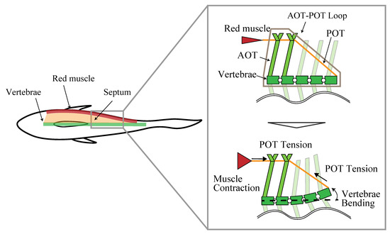 Westneat et al. proposed a model in which red muscle contraction is transmitted to the vertebrae by this AOT–POT loop [28]. The model is shown in Figure 1. In this model, the POT connects the red muscle to the vertebrae and acts as a wire, and the contraction force of the red muscle is transmitted to the vertebrae as tension by the POT. The AOT plays the role of a beam that holds the red muscle and part of the POT on the outside of the body.