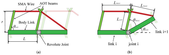 The bending curvature, , when the actuator generates a strain of as shown in Figure 2b is calculated geometrically by following the steps. , , and are the lengths of SMA wire parallel to the body link, SMA wire oblique to the body link when bending motion is generated, and the rigid beam, respectively, and are expressed by the following: