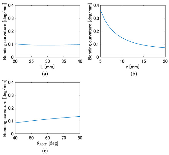 The bending curvature was calculated by fixing two of the parameters of L, r, and and varying one using Equations (3)–(5). Values of L = 30 mm, r = 15 mm, and = 60 deg were used when each design parameter was fixed, and was used regardless of the conditions. Figure 3a–c shows the curvature when L, r, and were varied, respectively.