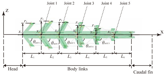 where is the position in the body length direction. The head and caudal fin parts are attached to the front and back of the body with the same length as the links; therefore, the value of starts at 30 mm and ends at 180 mm. The body width, , and height, , at each body length position can be obtained by substituting the values in Table 4 into Equations (6) and (7). Values in Table 4 are taken from reference [7].