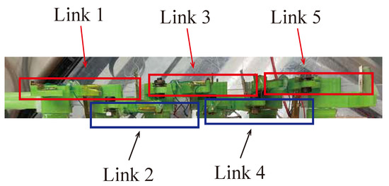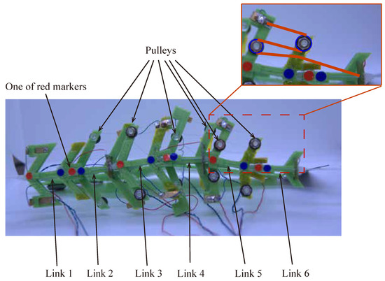 Figure 9 shows the improved UEC Mackerel design. As shown in Figure 9, the SMA wire is reciprocated using a pulley to increase the length of the SMA wire without changing the design parameters, thereby increasing the extent of contraction. The first module has no reciprocation, the second and third modules have one reciprocation, and the fourth and fifth modules have two reciprocations.