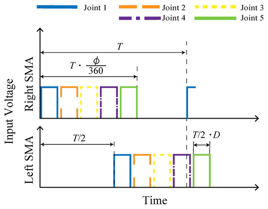 Figure 7 shows the voltage input to the left and right SMAs of each module. When the period T (s) and phase difference (deg) are set, the elapsed time from the start time of application to the first module to the end time of application to the fifth module is expressed as (s). In addition, when the duty ratio of each input is D, each voltage is applied for (s).