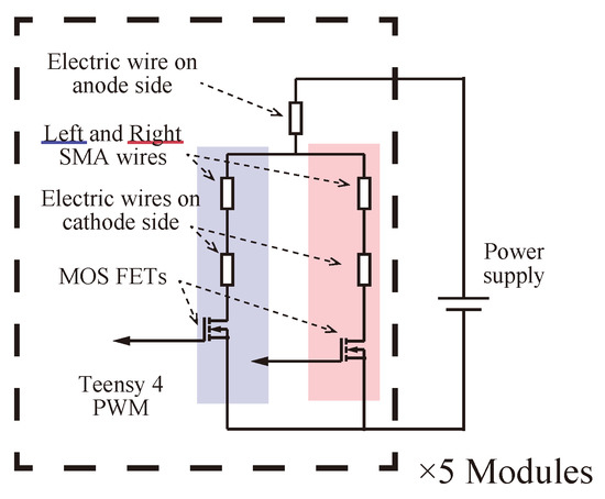 Figure 8 shows the electrical model of the module control unit. Each SMA wire is driven by applying a signal voltage from the microcomputer Teensy 4.0 to the MOSFETs at the time shown in Figure 7.
