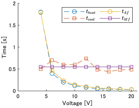 In this paper, shape memory alloy (SMA) wires were used as actuators. SMA has the property of recovering strain induced by the loading process when heated based on a thermo-elastic martensitic transformation [30]. By applying a voltage to both ends of the SMA, it can be heated and contracted by resistive heat. In this paper, Toki Corporation’s BMF75 SMA was chosen because it requires a lower voltage and produces strain similar to that of red muscle [31] (refer to Table 5).