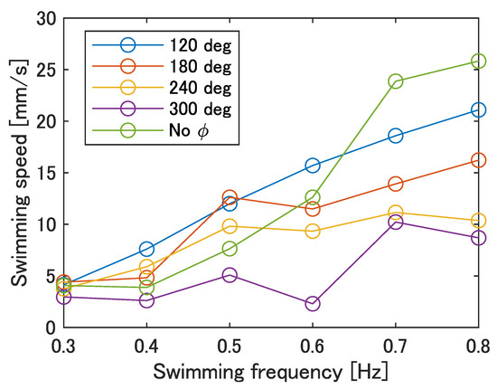 Figure 12 shows the swimming speed at each swimming frequency. The swimming frequency was assumed to be the same value as the input frequency. As shown in Figure 12, the maximum swimming velocity was 25.8 mm/s at a frequency of 0.8 Hz with no phase difference. Furthermore, compared to the prototype in our previous work [23], the swimming speed tended to increase with an increase in frequency at all phase differences. Therefore, an improvement in the swimming performance can be expected at any phase difference as the robot’s frequency response improves.