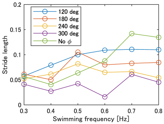 Figure 13 shows the stride length at each swimming frequency calculated by Equation (1). In Figure 13, the maximum stride length was 0.14 at 0.7 Hz with no phase difference, and the minimum was 0.02 at 0.6 Hz with = 300 deg. Compared to actual fish, the stride length of the prototype fish is about 40% of that of auguilliform swimmers and 23% of that of subcarangiform and thunniform swimmers, indicating that the stride length needs to increase by improving the swimming speed.