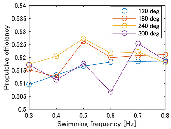 Figure 14 shows the propulsive efficiency at each swimming frequency calculated by Equation (2). As shown in Figure 14, = 240 deg was the maximum at the most of the frequencies, especially at 0.5 Hz with an overall maximum value of 0.527. The phase difference of the carangiform swimmer is about 225–300 deg, which is consistent with the trend of the robot. Therefore, it is possible that the parameters of no phase difference and = 120 deg, which currently result in the highest swimming speed, do not allow for efficient swimming, and improvement in the swimming performance at high phase differences is required.