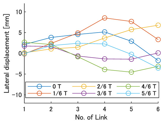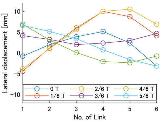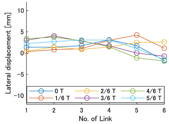 Next, the swimming shape was examined by measuring the lateral displacement of the red marker on each link, as shown in Figure 9. Figure 15, Figure 16, Figure 17, Figure 18 and Figure 19 show the lateral displacement of each link in one cycle when the swimming frequency is 0.8 Hz and the phase difference is = 120–300 deg or there is no phase difference.