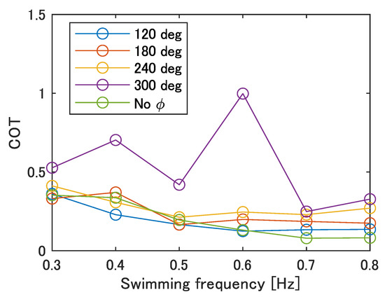 The reasons for the generally high COT at = 300 deg, with a maximum value at 0.6 Hz, are considered to be as follows. Focusing on Equation (13), the two variables are the swimming speed, u, and the power consumption, P. The price of the COT increases when the swimming speed, u, decreases and the power consumption, P, increases. Figure 12 shows that the velocity of movement, u, takes on smaller values for lower frequencies and for larger phase differences. In contrast, Table 7 shows that the calculated average power consumption, , per cycle is larger at higher frequencies. Therefore, the COT was high at = 300 deg, where the swimming velocity was overall low, and the maximum COT was observed at 0.6 Hz, where the swimming speed was low despite the increase in frequency. On the other hand, at 0.7–0.8 Hz, where the COT reaches its minimum value for each , the smaller the value of , the smaller the COT and the more efficient the swimming. Since the power consumption is the same regardless of the phase difference at the same frequency, the cause is considered to be the decrease in the swimming speed.