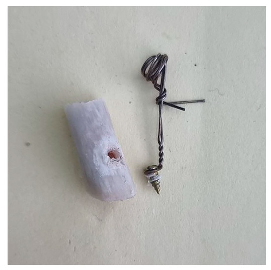 Right after micro-CT scanning, samples were taken to the Biomaterials Department of Tabriz Faculty of Dentistry to undergo a pull-out test and measure the quantitative osseointegration in inserted fixtures in all three groups (Hounsfield Universal testing machine). A stainless-steel arch wire (0.5 mm, Ispringen, Remanium, Germany) was used to fix the screws to the tensile grip. For each test, a wire was made dead under flame temperature then it was twisted one round below the screw head as in Figure 2 at strain rate of 0.5 mm/min to gain stable support of the screw whilst performing the test.