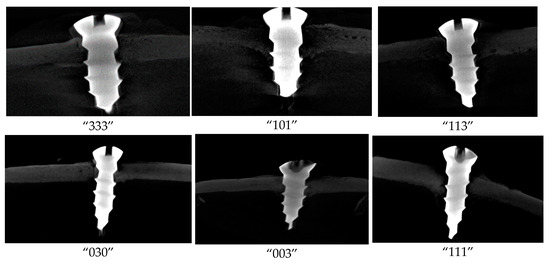 Micro computed tomography cuts of samples. The number of samples have been written under each sample. Radiolucencies around screw threads are due to drilling size, which gave us a slight micro defect around screws to assess the bone regenerating process.