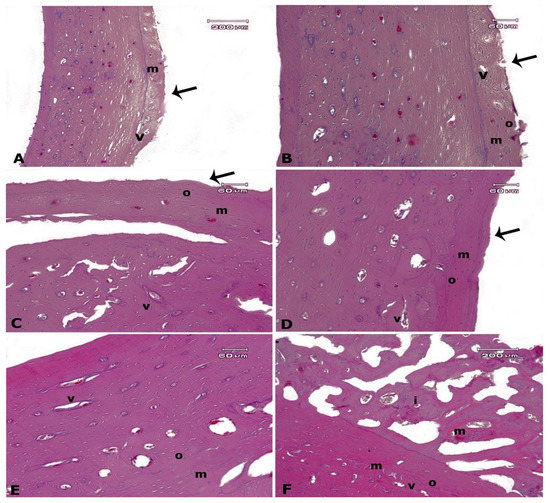 Rabbit histology of bone formation. (A,B): control group; (C,D): One-time treated group; (E,F): Three-time treated group. There was normal histology of bone matrix (m), Volkmann’s canals (v), and osteocytes (o), associated with no inflammation and bone necrosis in all experimental groups. Arrows are indicating bone formation zones, which were more severe in Three-time treated group compared to One-time treated group. There were mature and immature bone formations simultaneous in Three-time treated group (H&E). Regions of active ossification and newly formed bone are indicated by arrows in subfigure (A–D).