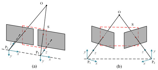 In general binocular vision models, since just a translation variation exists between two cameras, the corresponding points in the overlapping area only have horizontal parallax, as shown in Figure 1a. Actually, when two eyes stare at an object, they converge, so that the object is imaged at the symmetrical point of both eyes’ retinas, producing a fused vision. The associated camera model is depicted in Figure 1b. Between the two cameras, there is rotational variation in addition to translational variation, thus, the pose relationship is extremely difficult to establish, due to the intricate camera motion. The resulting viewpoint and view direction differences seriously limit the matching performance of humanoid-eye binocular images. Recent years have witnessed great progress in image matching algorithms, and these techniques can be broadly classified into two groups: area-based methods and feature-based methods. The area-based methods often depend on appropriate similarity judgment criteria, for creating pixel-level matches between images, including mutual information [4] and normalized cross-correlation coefficient [5]. These approaches are widely used in medical image processing, and achieve favorable performance. However, they are only suitable to image pairs with translation variation, small rotation, and local deformation. Meanwhile, they are also susceptible to appearance changes by noise, varying illumination, and geometric distortions.