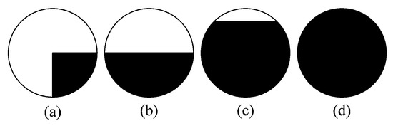 Figure 3 shows a principle diagram of the SUSAN algorithm. The dark area represents the image surface. As depicted in Figure 3a, the USAN area reaches the minimum when the nucleus is located at a corner, and expands even further as the nucleus approaches the surface, as described in Figure 3b,c, respectively. Figure 3d shows that the USAN area reaches the maximum when the nucleus completely lies in the flat region.
