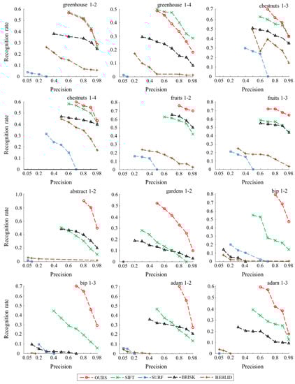 - Matching the first image with the remaining five images in each image sequence. To adjust the number of matches, the precision, , is considered, where TP is the number of correct matches and MP is the number of constructed matches.