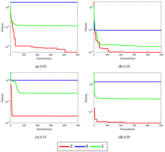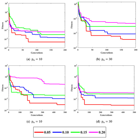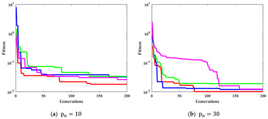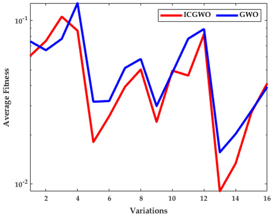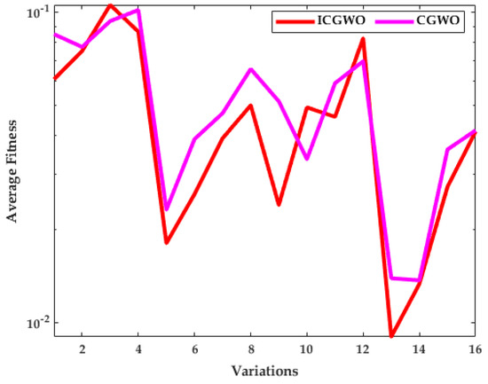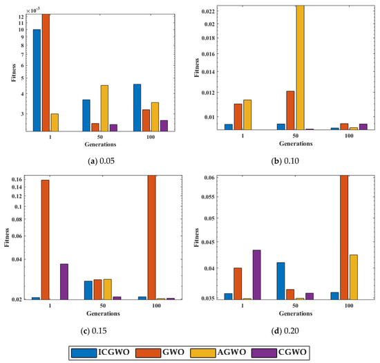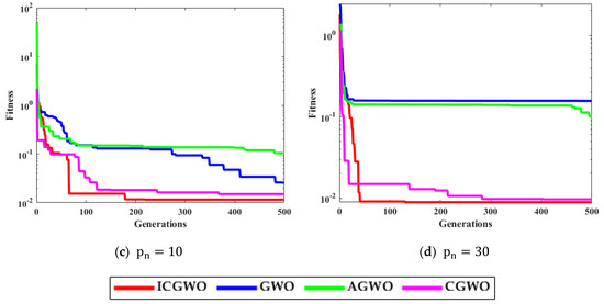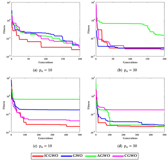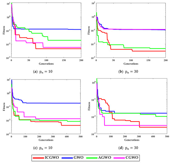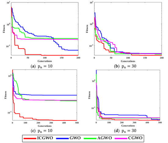 - The performance of the proposed ICGWO scheme is examined in detail through comparison with the conventional counterparts for various generations, populations, and noise levels.