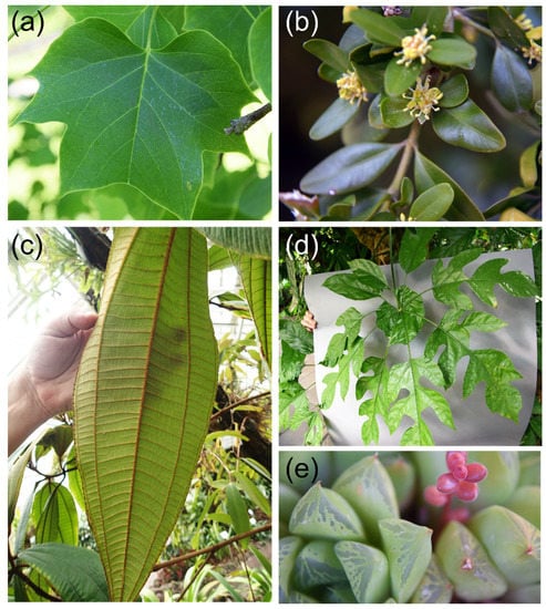 - Ellis, B.; Daly, D.C.; Hickey, L.J.; Johnson, K.; Mitchell, J.D.; Wilf, P.; Wing, S.L. Manual of Leaf Architecture; The New York Botanical Garden Press: Ithaca, NY, USA, 2009. [Google Scholar]