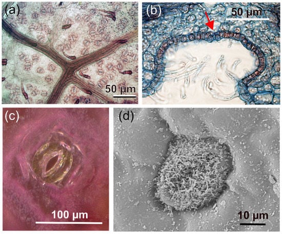 As the interface between leaf tissue and environment, the leaf surface shows a huge variety of functional structures (Figure 7). The outermost layer of the leaf is the cuticle, which is a waxy film covering the epidermis. In various plant species, the cuticle features intricate hierarchically arranged wax crystal nanostructures, which have become famous in biomimetics as causing strong water repellency, termed the “Lotus effect” []. These structures are not be further considered here because they are covered by recent reviews on plant surface structures and their biomimetic relevance [,,,,].