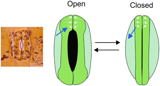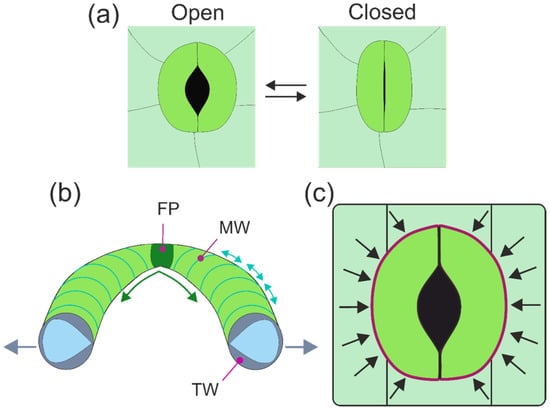 The mechanics of opening and closing the aperture require differential structural properties of the guard cells and is still a matter of debate. The classic view explains stomatal opening by the thickened inner walls of the guard cells, meaning the wall parts facing each other that border the stomatal pore area (sometimes also termed “ventral walls”) [,,] (Figure 5b). Upon increasing turgor pressure, guard cells bend backwards because of the thickened and therefore stiff ventral wall part. Quite early on, however, another feature of guard cells, the radial alignment of cellulose microfibrils [], was suggested as a key element for stomatal movement, together with the fixation of the polar ends of the guard cells [,] (Figure 5b). The radial cellulose microfibrils prevent the substantial swelling of the guard cells upon rising turgor and deflect the pressure in the longitudinal direction of the guard cells. This leads to bending, which is promoted by the fixed polar ends of the guard cells (Figure 5b). In an alternative model for the micromechanics of guard cell bending, the differential stiffening of the cell wall by a radially increasing E-modulus would be responsible for aperture changes. In a recent study, evidence was found of a higher stiffness of the polar ends of the guard cell walls. which was also discussed as potentially important for the backward bending of the guard cells []. In summary, stomatal mechanics are not yet completely understood and still a topic of research and debate [].