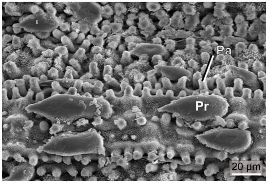 SEM image of a lower leaf surface of the bamboo species Phyllostachys aureosulcata. The leaf surface is richly decorated with papillae (Pa) and prickle hairs (Pr). The whitish cover is caused by wax crystals.