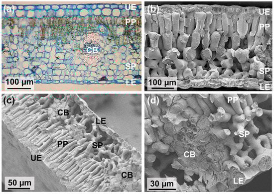 The leaf tissues as visible in cross-sections through bifacial leaves. (a) A leaf of Psidium littorale (strawberry guava). In this light microscope image, the chloroplasts are visible as greenish dots in the palisade cells. (b) SEM image of a cross-section through a leaf of Laurus nobilis (laurel). In this image, the three-dimensional intercellular air space in the spongy parenchyma becomes more visible. (c) SEM image of a cross-section through a leaf of Juglans regia (walnut). Here, two veins (CB) embedded in the mesophyll are visible. (d) A close-up of the vein region of the leaf shown in (c), illustrating the tight connection between vein and mesophyll, and the complex intercellular air space. UE: upper epidermis, LE: lower epidermis, PP: palisade parenchyma, SP: spongy parenchyma, CB: conducting bundles of the leaf venation (see also Figure 2).