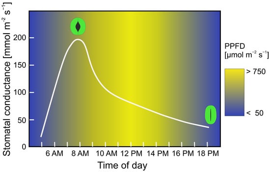 Photosynthesis, the production of sugar from CO2 and water to gain metabolic energy and biomass (as construction material and for other purposes), is the essential and original function of a leaf. To keep photosynthesis running, the CO2 from air as a raw material for sugar production has to be supplied to the production sites, the chloroplasts, which are located within leaf cells. The leaf must therefore be permeable to air so that CO2 can diffuse toward and into the chloroplasts, following a concentration gradient created by photosynthesis (Figure 2). To prevent the leaf from uncontrolled dehydration, its “skin”, the epidermis, is covered by a wax layer, known as the cuticle that is, however, also quite impermeable to CO2. It is therefore necessary for the leaf surface to have sufficient gas permeability to supply the photosynthesis machinery with CO2. This is achieved by special pores, the stomata (Figure 2). The stomatal apparatus is constructed on the basis of two stomatal guard cells, which create a controllable aperture between them [], whose length is in the micron range. Gas permeability created by stomata is termed stomatal conductance and is permanently regulated in response to environmental conditions.