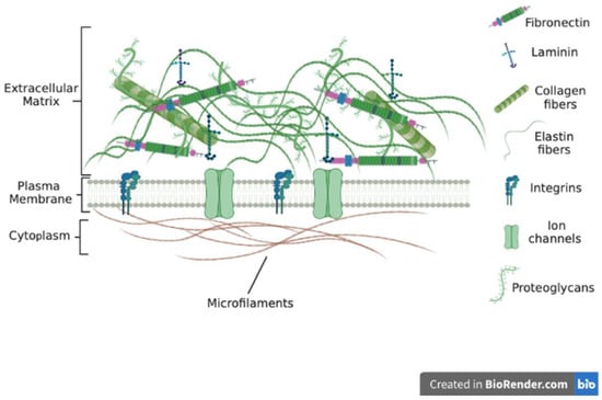 Tissues and organs in the human body are composed of cells, biomolecules as well as the extracellular matrix [1]. The extracellular matrix (ECM) is key in many developmental stages from embryogenesis to adult development, and tissue repair as well as the maintenance of tissue and organ homeostasis [1,2]. Once synthesized in the cytoplasm, ECM components are secreted into the extracellular space where they are then modified further into final molecules [1,2]. The main recognized function of the ECM is the provision of physical support for cells within tissues and organs as well as availing the transportation of biomolecules such as growth factors and cytokines to cells. Recent reports indicate that the ECM is involved in the activation of several mechanosensitive signaling cascades and therefore impacts several cellular processes [3,4,5,6,7]. The two forms of the ECM are the interstitial ECM and the basement membrane. This review mainly focuses on the interstitial matrix.