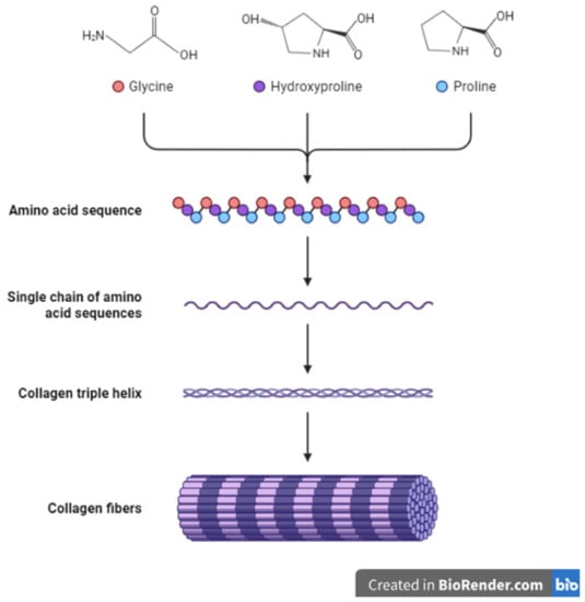 The collagen family of proteins is the major component of the ECM and provides both mechanical strength and cues to cells and tissues. Reports indicate that collagens constitute around 90% of the ECM in humans [34,41]. Thus, collagens influence many cellular processes in the body including proliferation, migration, and adhesion [44]. Currently, about 28 proteins have been identified to belong to the collagen family [45]. Being the major proteins in the ECM, collagens undergo multiple changes and remodeling throughout an animal’s growth and development and in pathological conditions such as wound healing and cancers [46,47,48]. In addition, the synthesis of collagens requires modifications through the addition of disulfide bonds and other post-translational changes (Figure 2) [49,50]. Other ECM molecules also play a role in collagen synthesis and deposition. For example, the glycoprotein fibronectin is known to play a part in and influence the deposition and attachment of collagens in the extracellular space [51,52]. The overall structure and organization of the ECM are therefore results of the interaction between its constituents including collagens, glycoproteins, and other molecules [17,18,51,53,54]. Seven collagens have been grouped in the fibrillar class with type I collagen (or collagen type I) being a major component of this class. The other members include type II, type III, type V, type XI, type XXIV and type XXVII collagens [10,19,44,45]. Most collagens that form part of the basement membrane are grouped in the network-forming collagen class and these include type IV, type VIII, type X, type XV and type XVIII collagens [45]. Type VI and type XXVI collagens form the filament-forming class. The triple helical structure of some fibril-linked collagens can be interrupted and these include type IX, type XII, type XIV, type XVI, type XIX, and type XXII collagens [45]. Other collagens family members are found within or bound to membranes and these include type XIII, type XVII, type XXII, type XXIII and type XXV collagens [45].