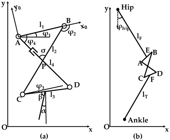 The lower extremity exoskeleton consisted of 11 basic parameters (, , , , , , , , , , ) and two inputs (, ), as identified through kinematic analysis. (, , , , ) represent the rod length of the mechanism, while (, , ) represent the initial position of rod AB. The positions of the thigh and calf links relative to the five-bar mechanisms are represented by (, , ). The variables and represent the nth length and angle input. Consequently, all the variables are expressed in the following equation: