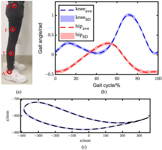 Walking gait. (a) Markers layout; (b) human walking gait angle; (c) ankle trajectory.