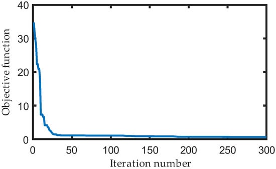 Using the particle swarm optimization algorithm in MATLAB, the optimization process was carried out with the following parameters: number of individuals in the population = 100, dimension of individuals in the population = 13, maximum iteration number = 2000, and learning factor = 2. The objective function converged in approximately 180 iterations, as illustrated in Figure 7. The optimal inputs of the 2DOF five-bar mechanisms can be observed in Figure 8, while the dimension parameters of the lower extremity exoskeleton are presented in Table 1.