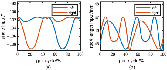 To compare the exoskeleton movement with human motion collected by the experiment, the kinematic model of the lower extremity exoskeleton was established to describe the movement position of the exoskeleton, as shown in Figure 3b. and represent the lengths of the exoskeleton thigh and calf, respectively. Based on the kinematics model of the five-bar mechanism, the ankle trajectory of the lower extremity exoskeleton can be expressed as follows: