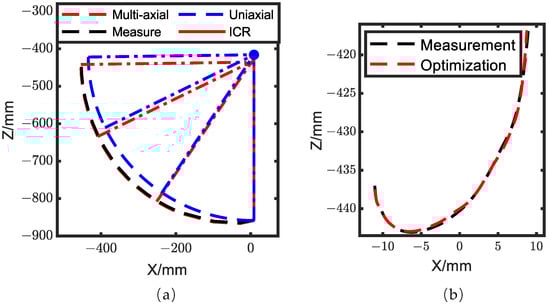 Trajectory comparison. (a) Ankle trajectory error of calf swing between the multiaxial and the uniaxial joints; (b) knee ICR movement trajectory comparison between measurement and optimization.