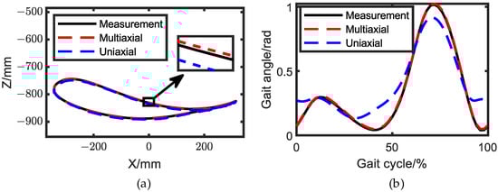 Walking trajectory comparison among measurement, the multiaxial joint, and the uniaxial joint. (a) Ankle trajectory; (b) knee gait angle.