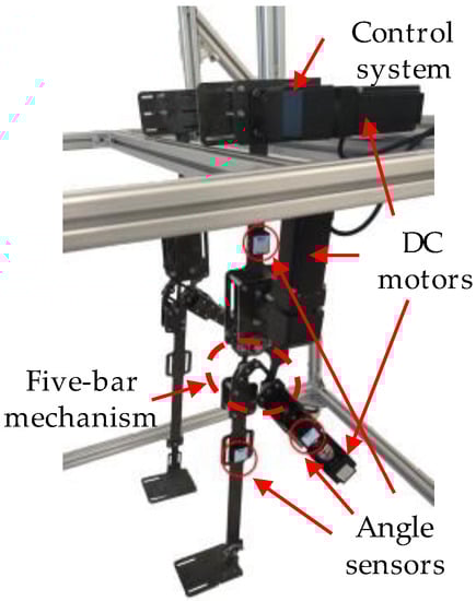 Based on the optimized structure parameters, we designed a prototype of the exoskeleton, as presented in Figure 11. The DC motors were driven through pulses generated by a PLC. To measure the motion of the exoskeleton, IMUs were installed on the mechanism, as reported in previous works [31,32]. The knee ICR and ankle trajectory were then calculated based on the measured data and dimension parameters.