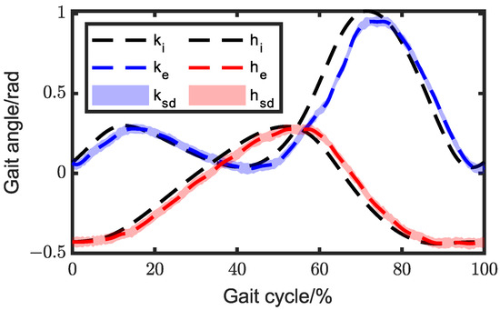 Comparison of the exoskeleton gait angle between the experimental and ideal angles with PID control. and represent knee and hip gait angles measured by the motion capture system; and represent the average gait angle; and represent the standard deviation.