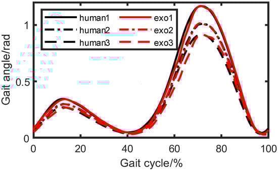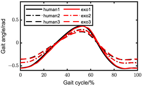 DC motor rotational speed was set based on optimization results, and the angle sensor data was transmitted to the PC in real time. The gait angle of the exoskeleton was collected to compare with the human gait angle measured in the third part, as presented in Figure 12. The results showed that the average errors of hip angle and knee angle were 0.038 rad and 0.059 rad, respectively. Upon observation, we noted that the gait angle showed similarities to the result of the motion capture experiment, although the problem of gait incoordination persisted. This issue could be attributed to the following factors: