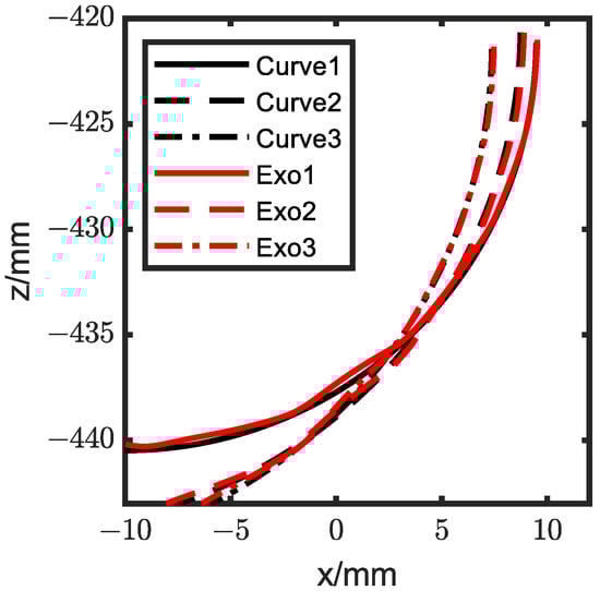To assess the exoskeleton knee ICR’s applicability to different individuals, we generated three arc curves to simulate knee ICRs for various people. According to the knee ICR measured by the motion capture system, we assumed that the ICR point when the swing angle was zero was the origin of the ICR and that the direction of the ICR origin was the negative x-axis. The following steps were taken to randomly generate an arc-shaped ICR: (1) randomly generate the coordinates of the ICR origin; (2) randomly generate the radius of the circular arc; and (3) combine the previously measured knee ICR to constrain the horizontal and vertical coordinates of the ICR endpoint, as shown in Equation (15). The parameters of the three randomly generated ICR curves are shown in Table 2.
