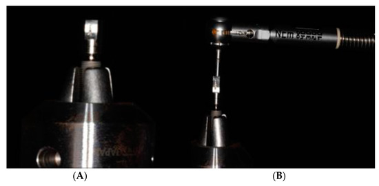 (A) Implants mounted on the holder of a digital torque meter. (B) The abutment screw was preloaded to 30 N.cm using a manual torque ratchet.