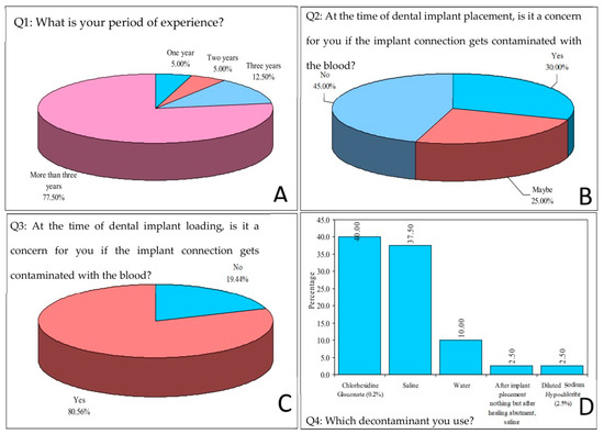 Analysis of survey responses. Responses for (A) Period of experience of the participant, (B) Concern regarding the contamination of the implant connection with the blood at the time of dental implant placement, (C) Concern regarding the contamination of the implant connection with the blood at the time of dental implant loading, and (D) Specification of the material for decontamination.