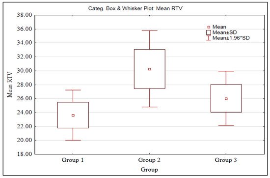 A significant difference was observed between Groups 1 and 2, Groups 1 3, and Groups 2 3 (p < 0.05) which indicates that the mean RTV scores are significantly higher in Group 2 as compared to Group 1, in Group 3 as compared to Group 1, and in Group 2 as compared to Group 3. The mean scores are also presented in the box plot (Figure 4).