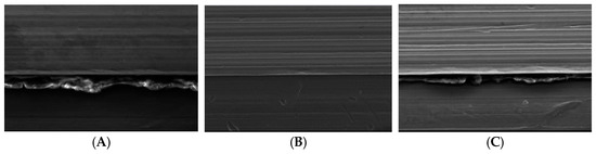 A prominent layer (bio- film) could be seen on Group 1 specimens (Figure 5A). Group 3 specimens also showed a biofilm layer, although it was not very prominent (Figure 5C). No such layer was evident on Group 2 specimens (Figure 5B).