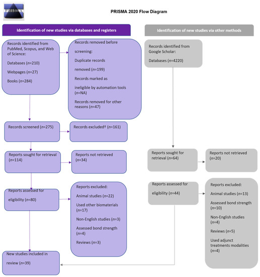 In the stage of data extraction, thirty-nine articles only in the English language were selected, and characteristic findings were extracted from original research and case series articles from the field of Dentistry/Biomaterials/Chemistry.